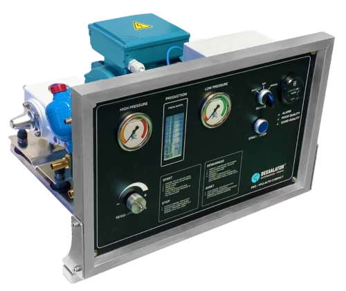 Dessalator conçoit des dessalinisateurs d’osmose inverse orientés fiabilité : pompes haute pression à piston céramique, pression stabilisée via accumulateur (réduction des à-coups) et automatismes de protection/contrôle qualité selon configurations. La gamme couvre environ 30 L/h à 2 000 L/h selon besoins (plaisance à usage pro).